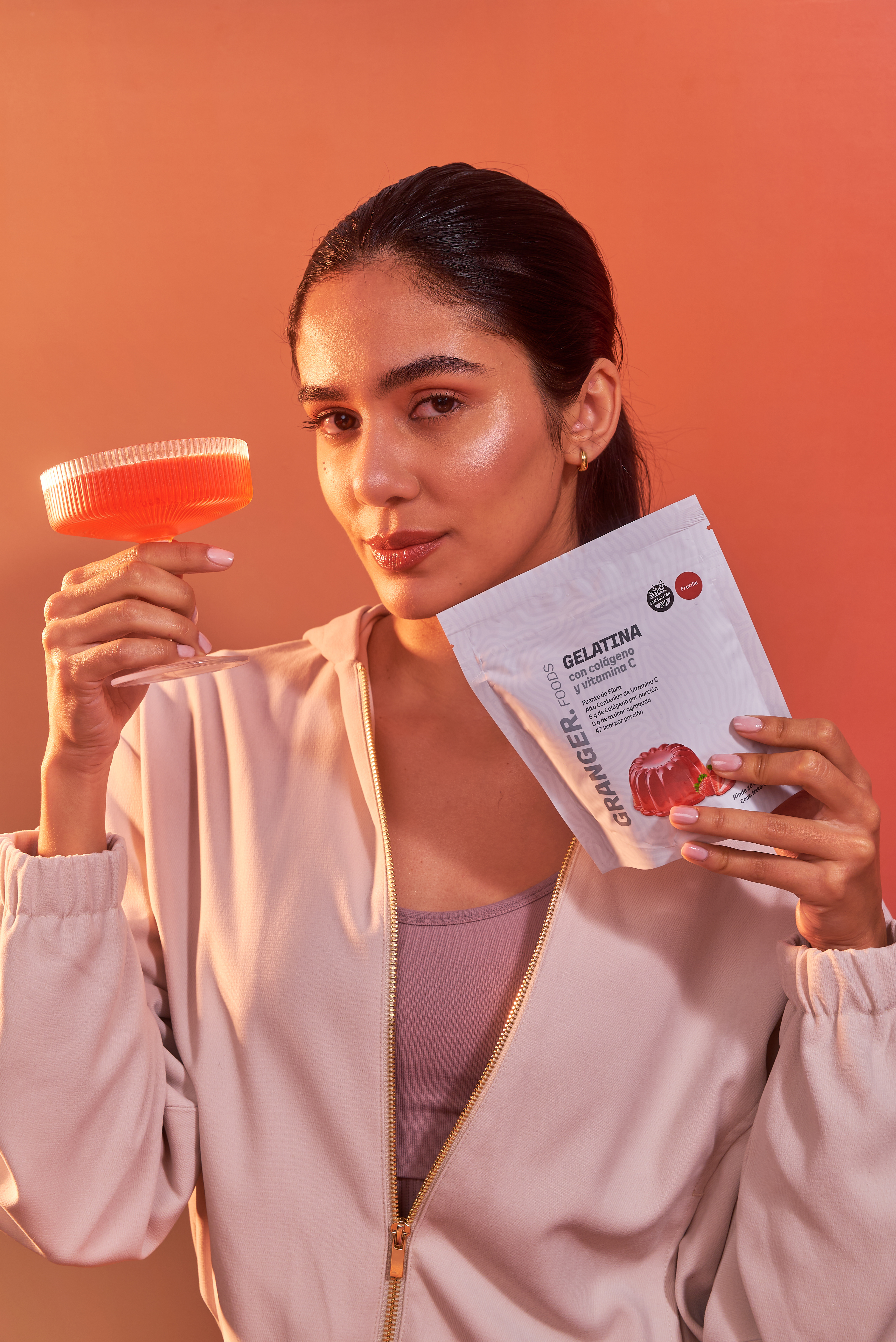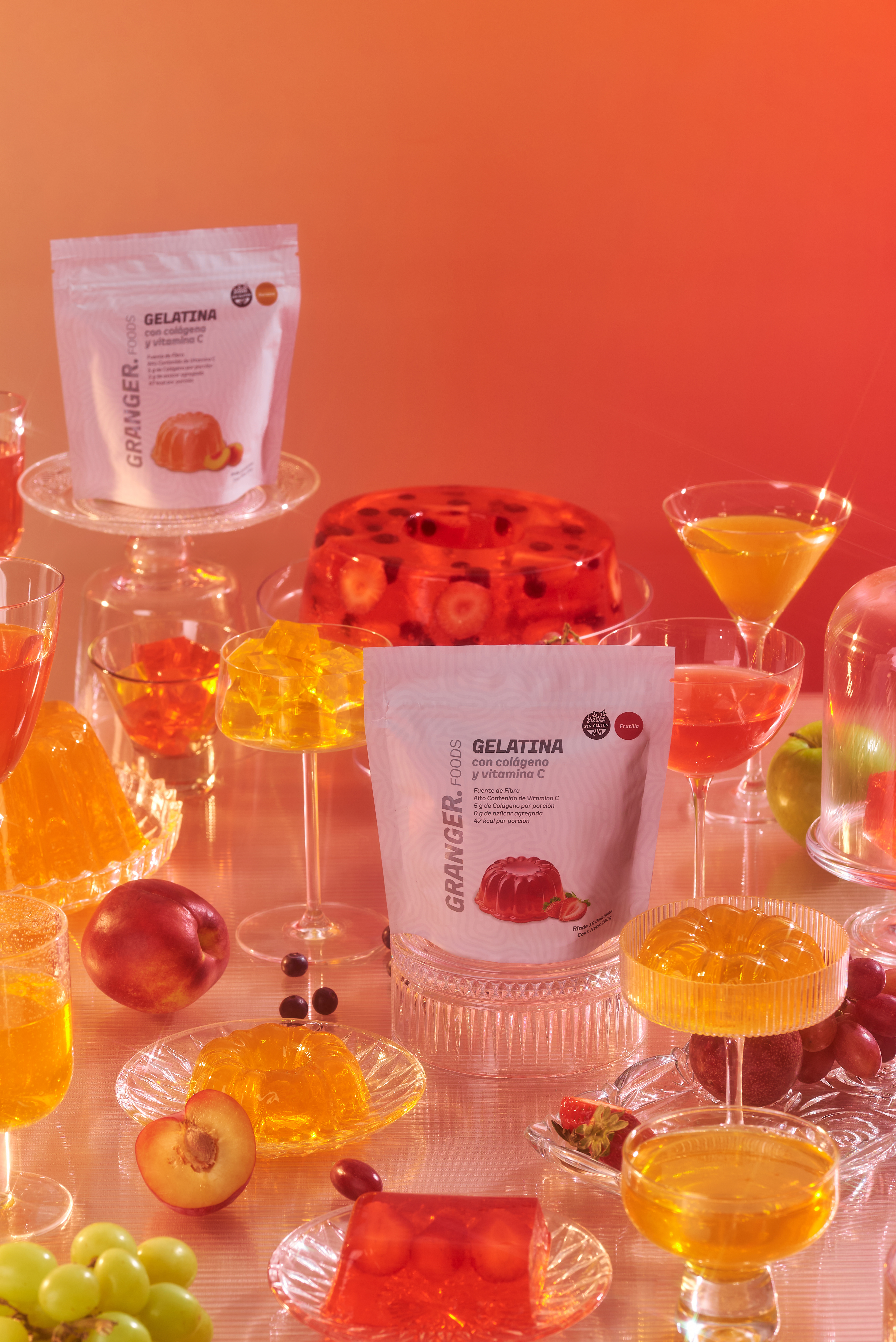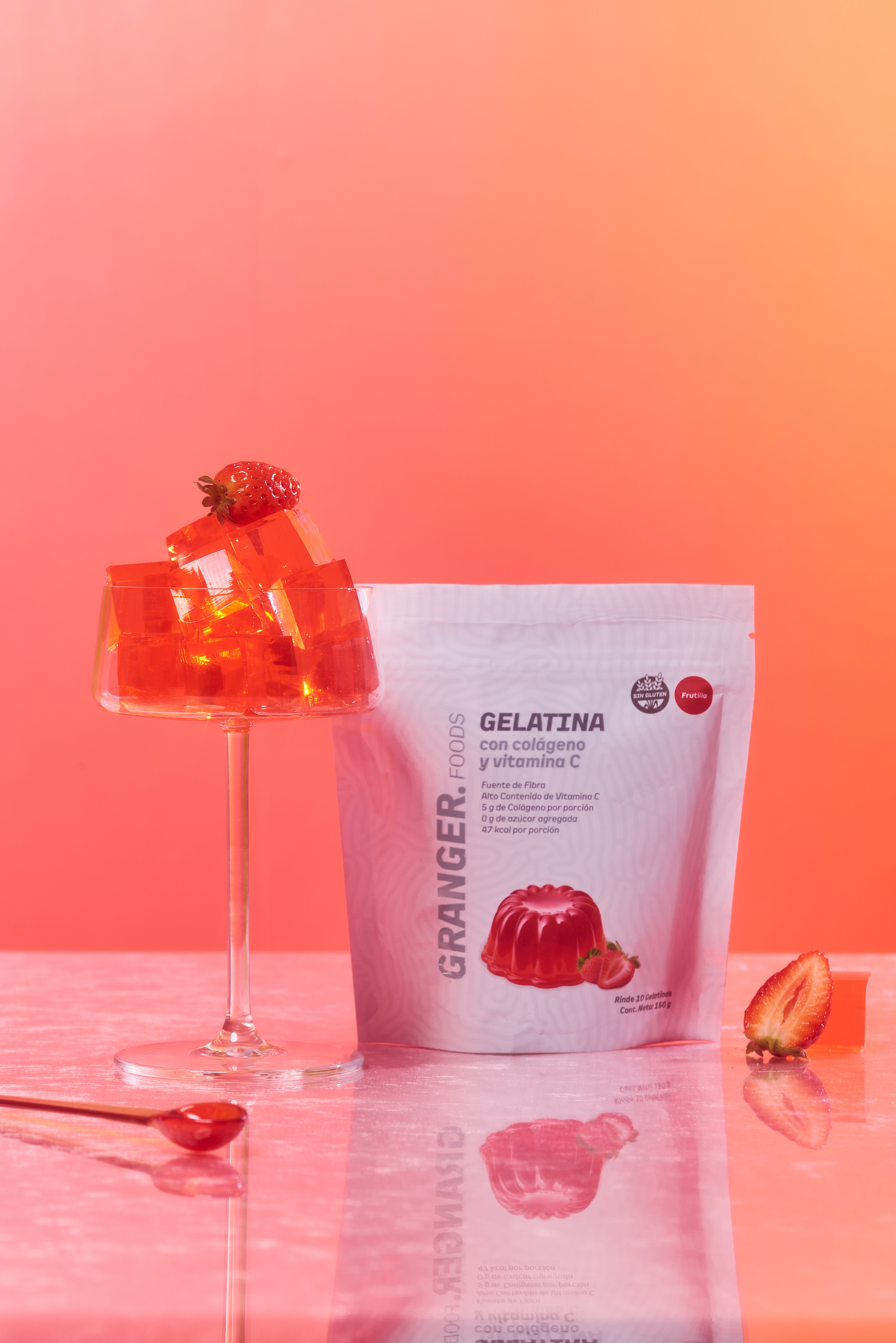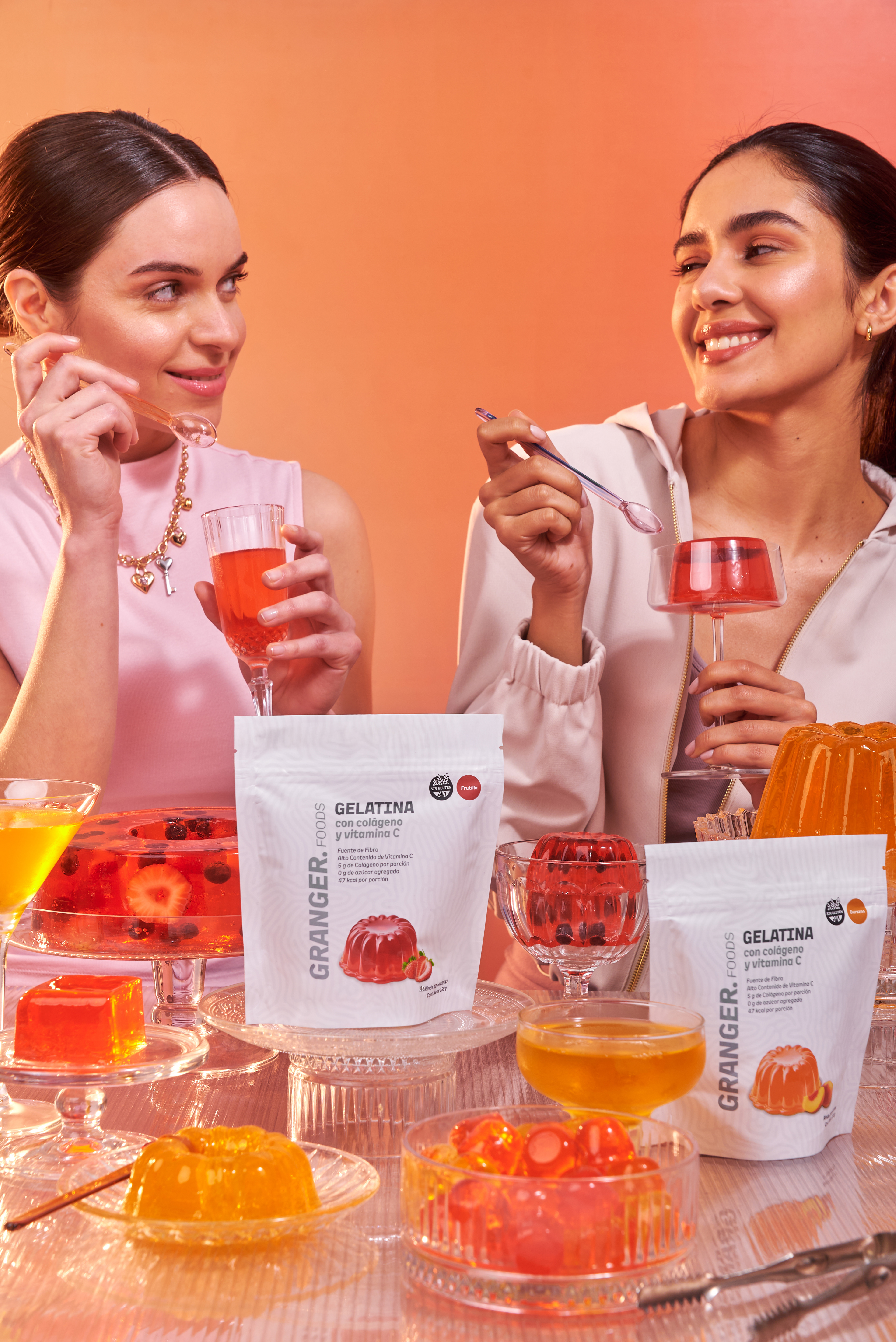 Una nueva forma de incorporar colágeno: en un postre. Fotografías para las nuevas gelatinas de Granger, con puesta de escena con dirección de arte, retratos con talentos, y food styling para el producto principal de ambos sabores: frutilla y durazno.