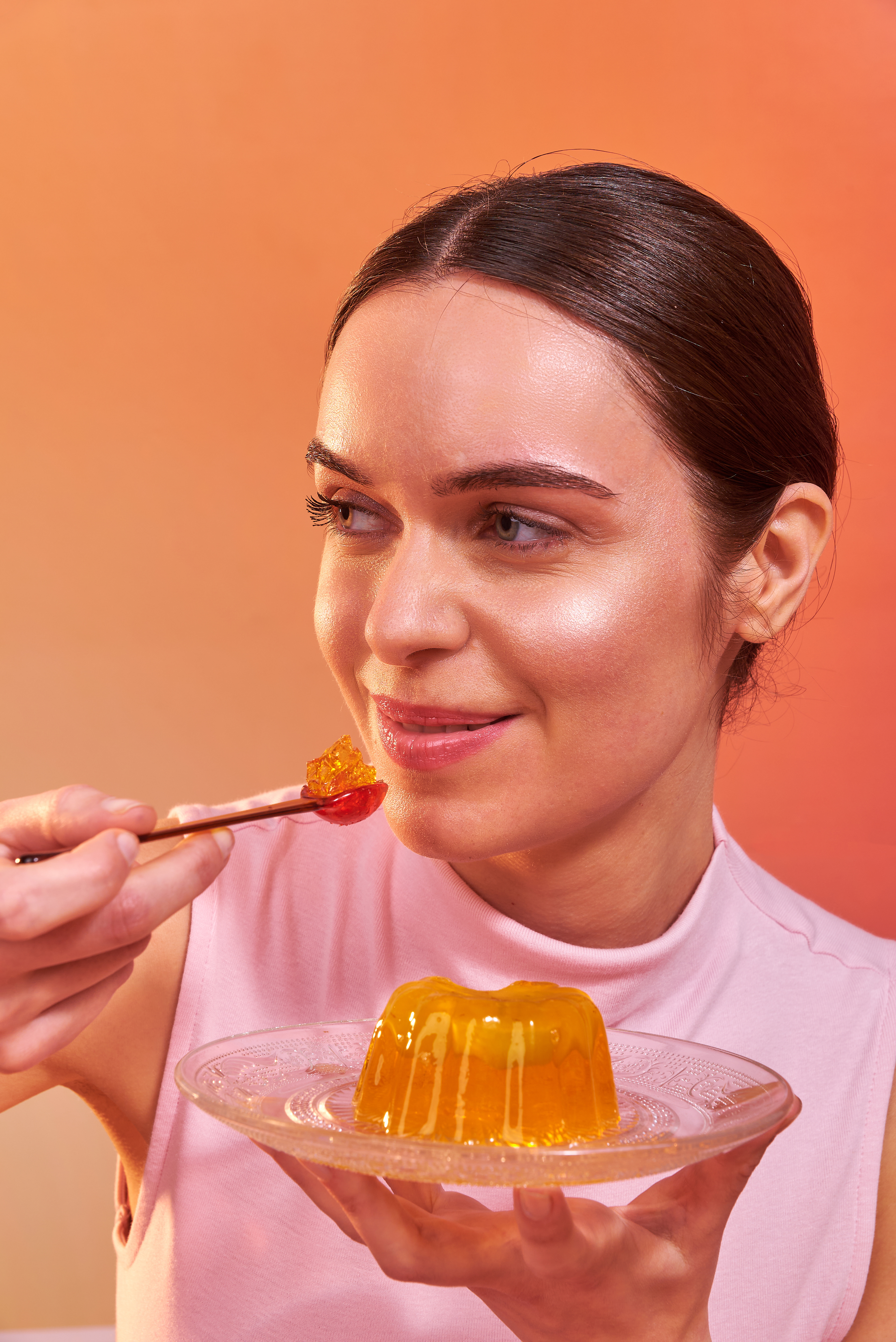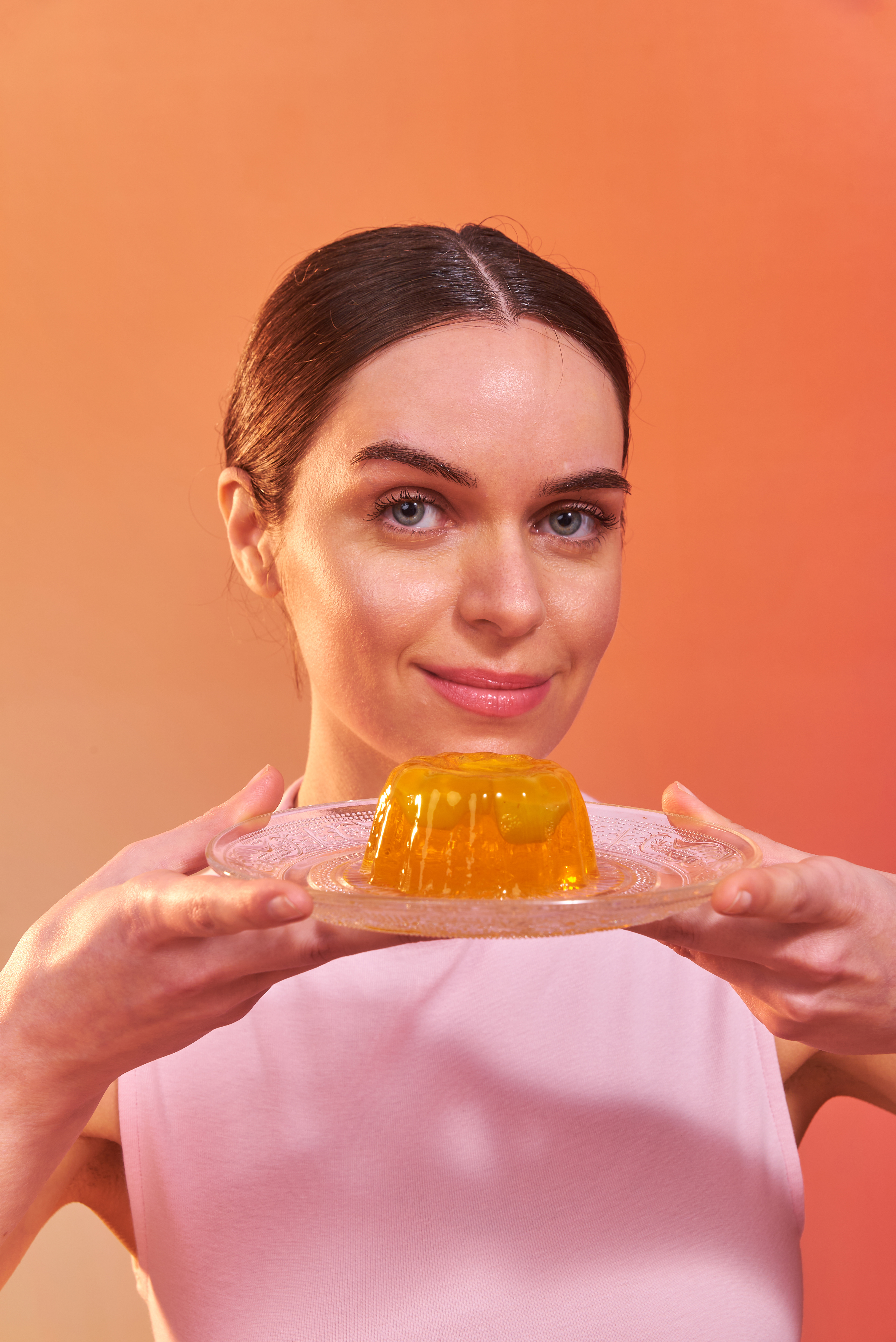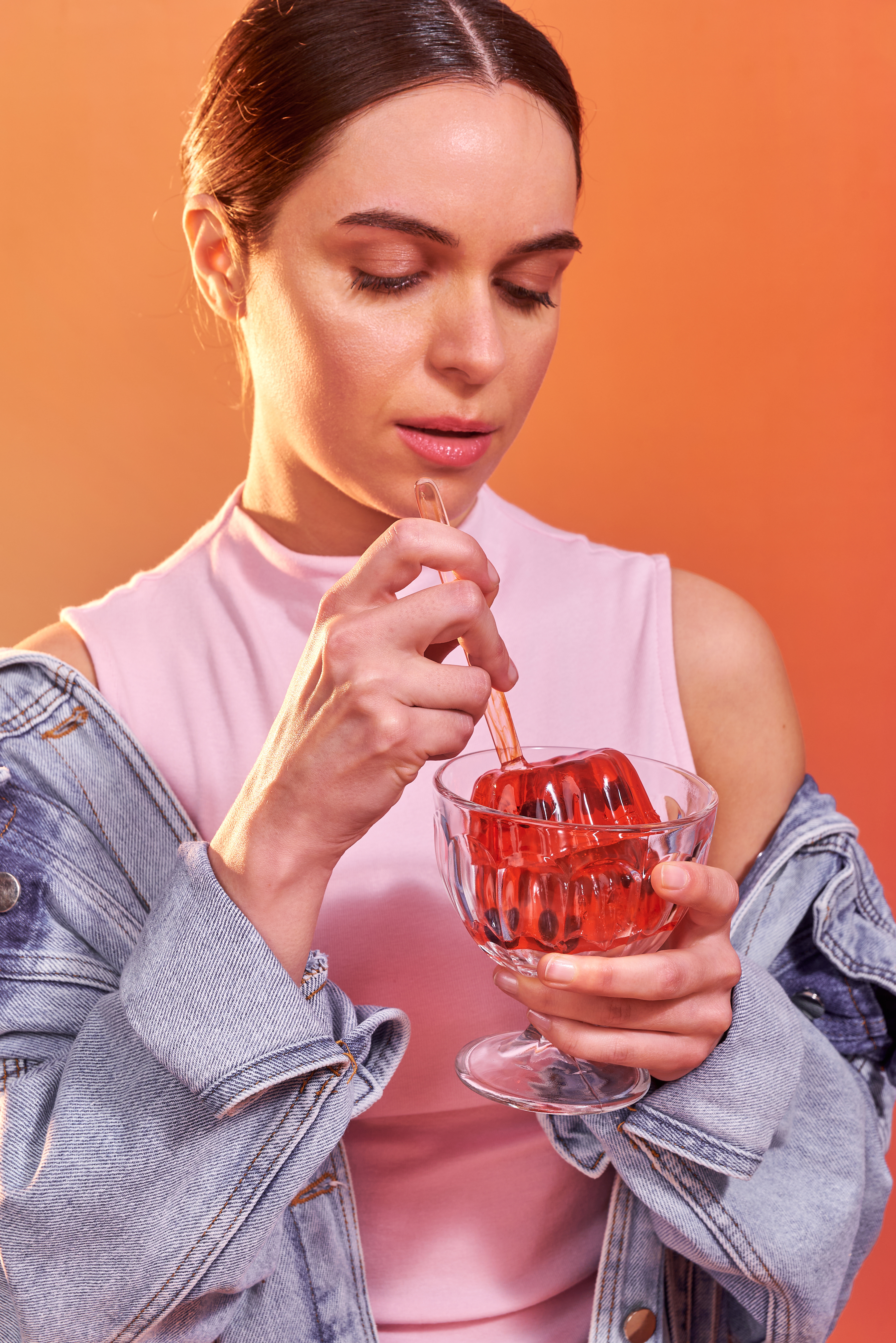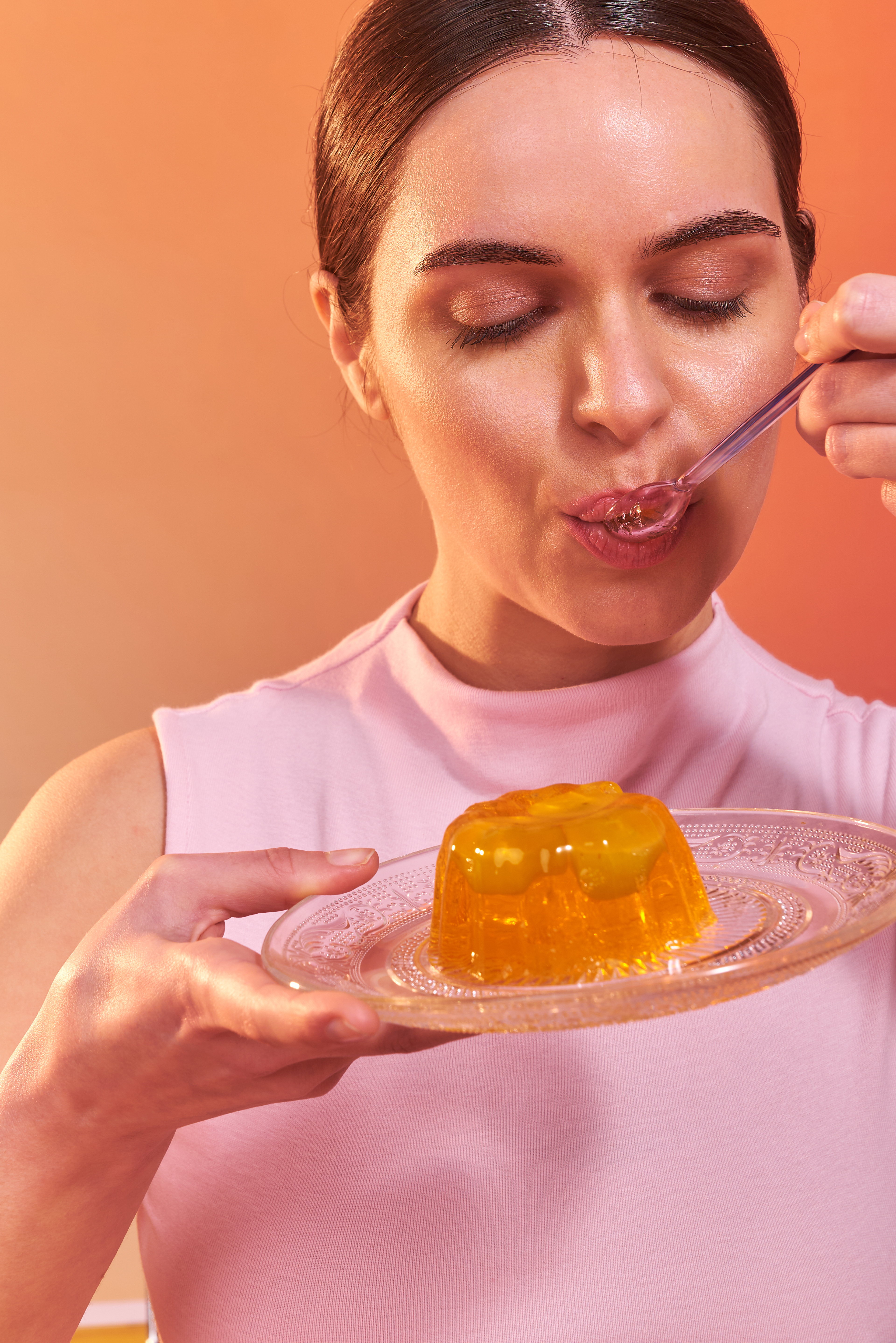Una nueva forma de incorporar colágeno: en un postre. Fotografías para las nuevas gelatinas de Granger, con puesta de escena con dirección de arte, retratos con talentos, y food styling para el producto principal de ambos sabores: frutilla y durazno.