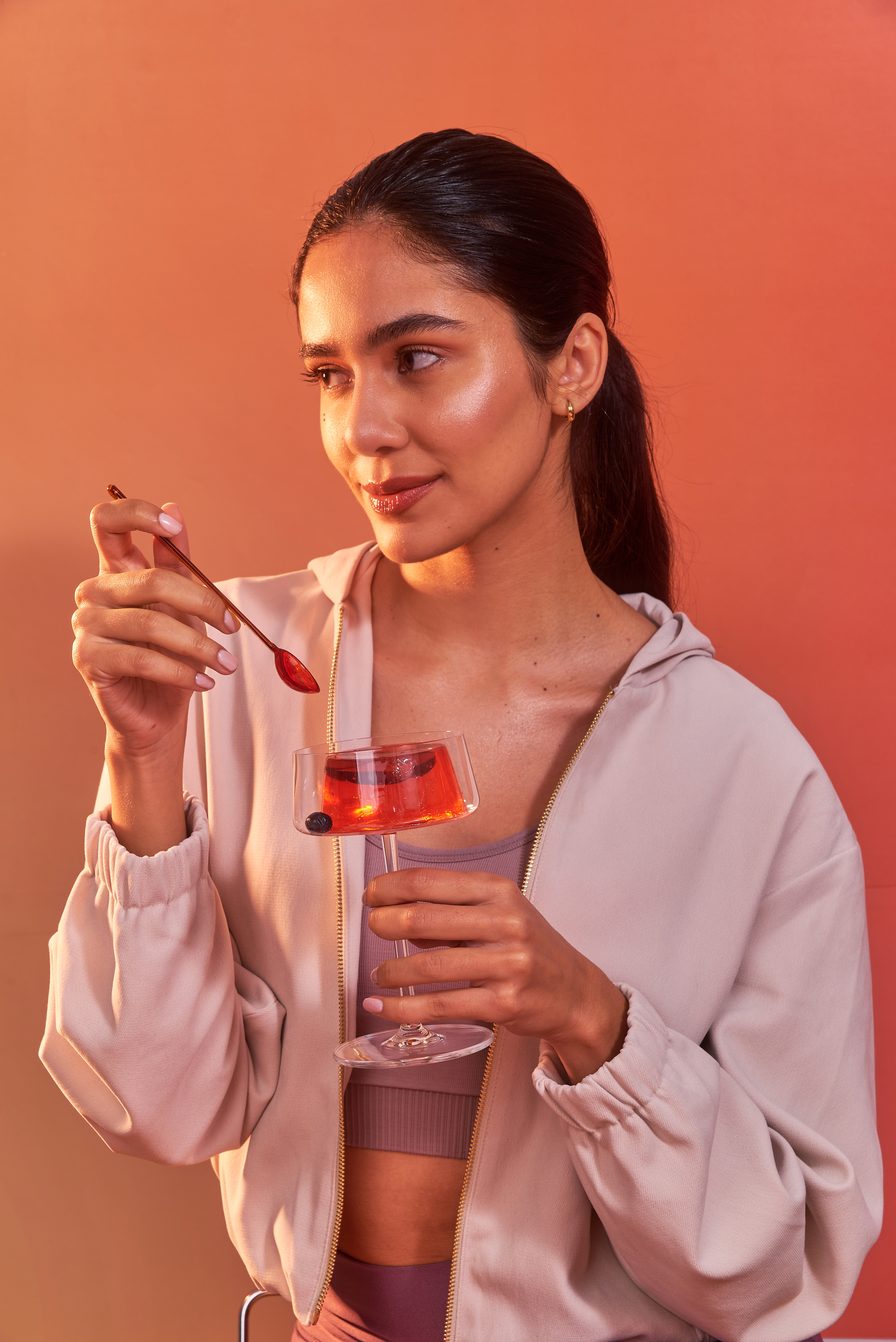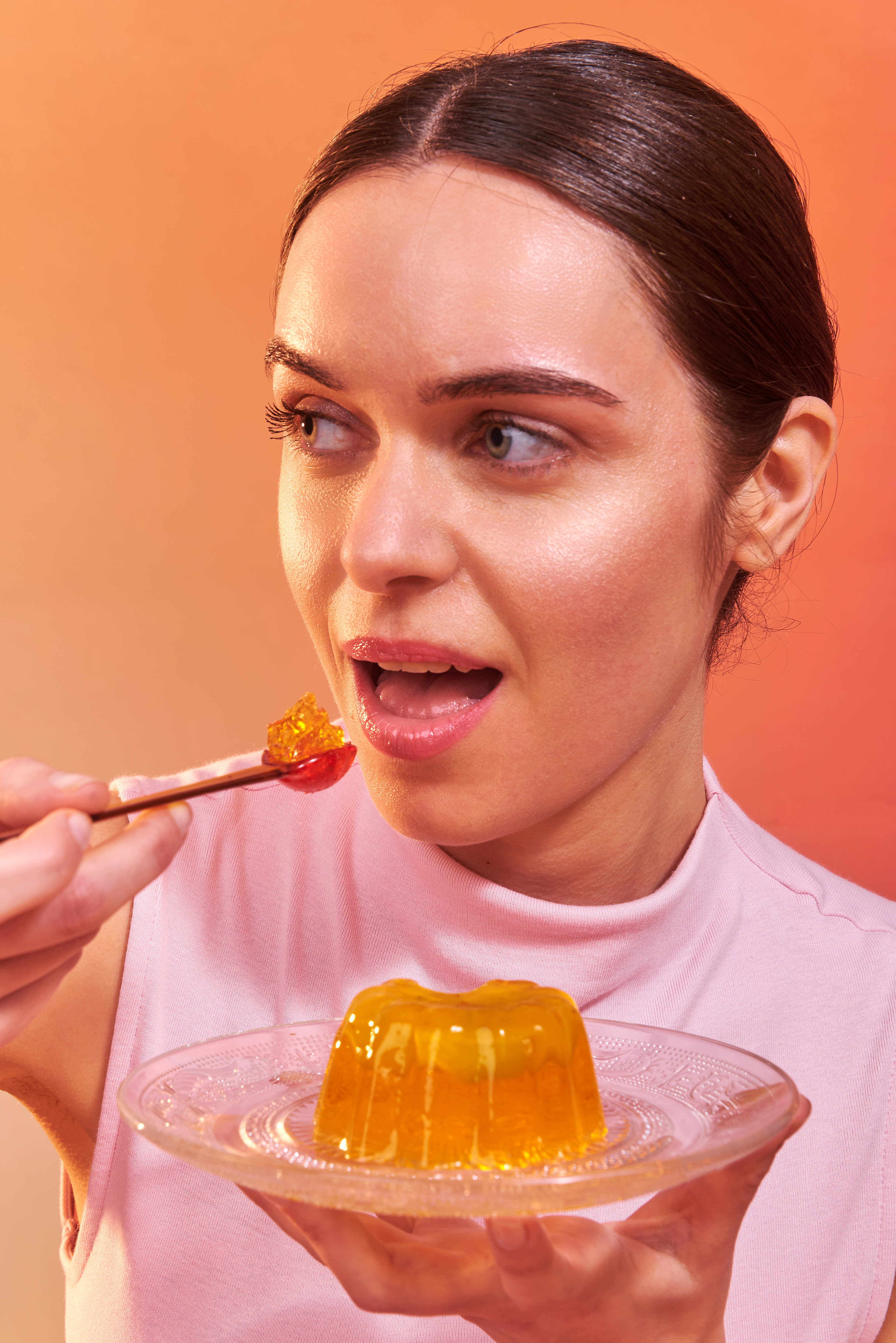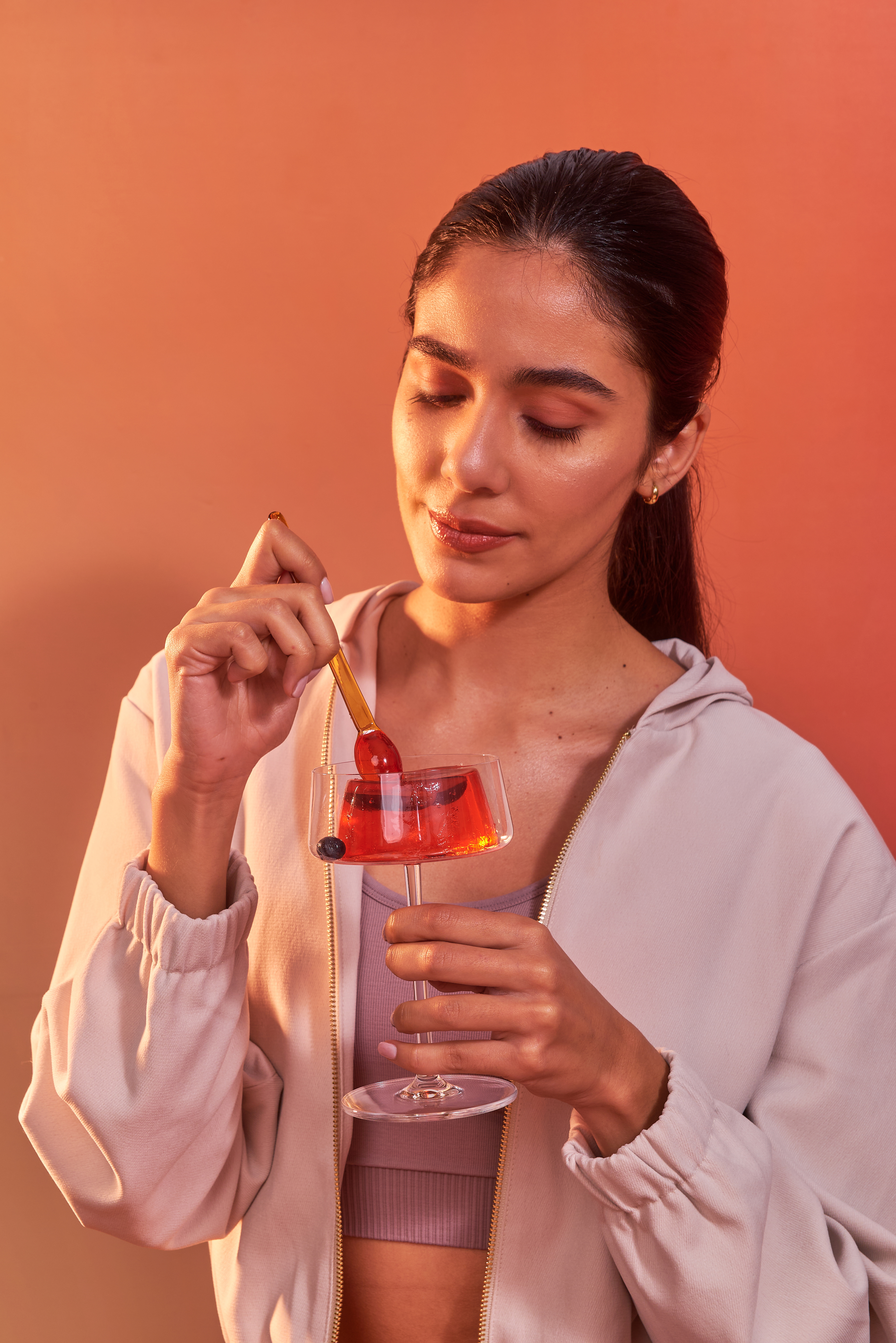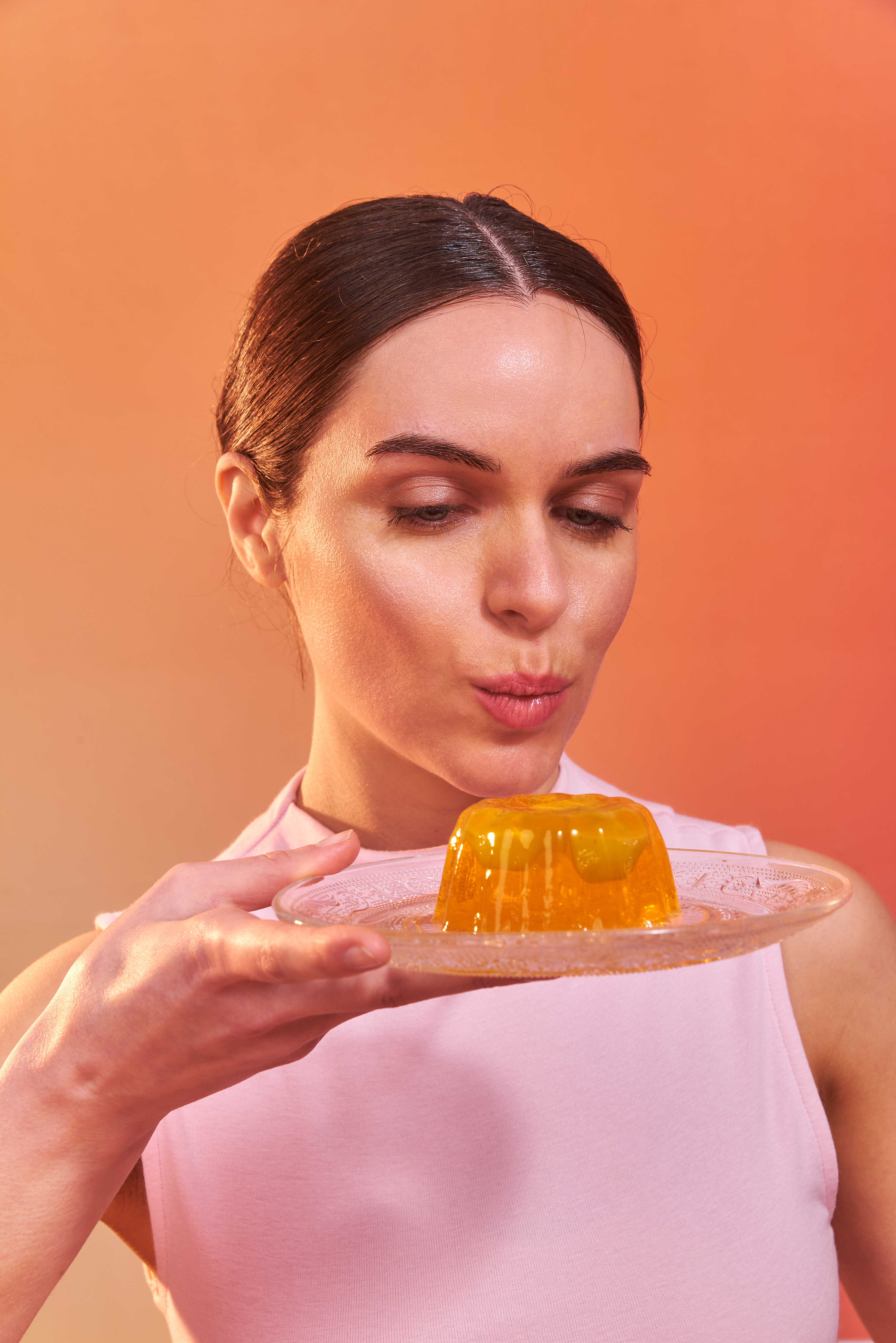 Una nueva forma de incorporar colágeno: en un postre. Fotografías para las nuevas gelatinas de Granger, con puesta de escena con dirección de arte, retratos con talentos, y food styling para el producto principal de ambos sabores: frutilla y durazno.